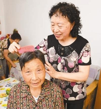 夏玉波(右)在照顾老人。资料照片