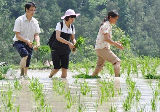 周晓琳(中)在帮助镇南村村民插秧(资料照片)陶亮 摄