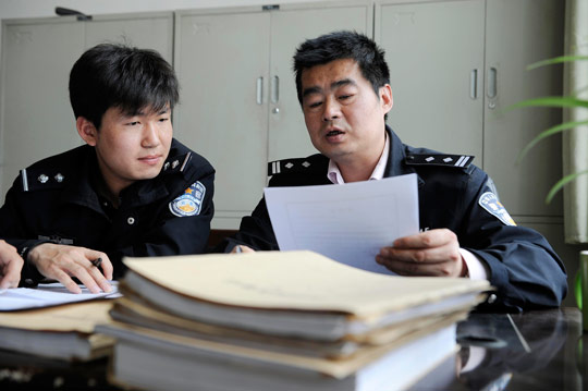这是2011年,张晓虎(右)和同事一起侦办案件。(资料照片)