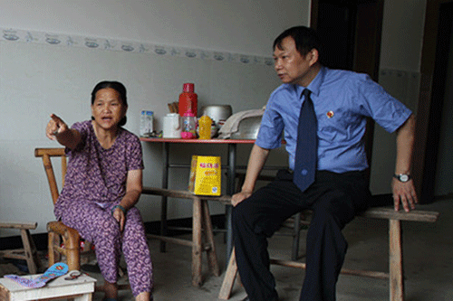 图为张延群(右一)在江西省南丰县琴城镇茅店村大窠堡村民家中走访了解法律诉求。 南纪 摄