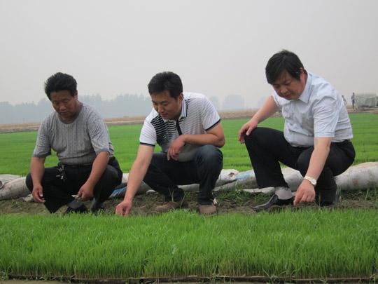 图为孙守则(左一)正在查看全村育秧基地内秧苗的长势。(资料图片)