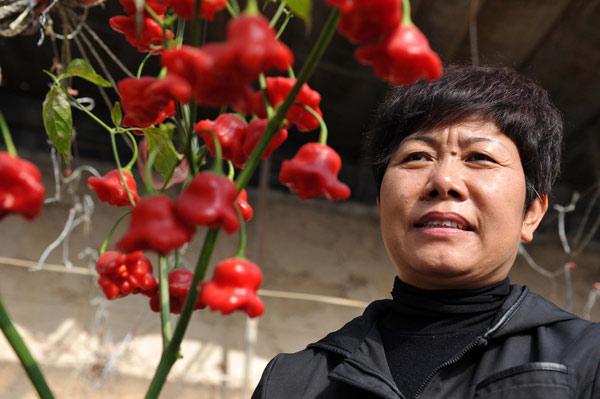 王金燕查看新培育的辣椒。新华社记者 彭昭之摄