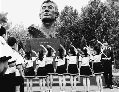 七月二十六日,河北省沧州市烈士陵园,少先队员们向张楠塑像敬礼。(记者 陈斌 摄)