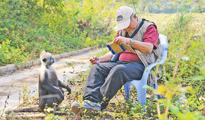在崇左研究基地,潘文石和他的“访客”白头叶猴。赵 一摄