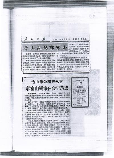 1987年4月,郭富山走完了自己艰辛的一生。宋平得悉噩耗后,十分悲痛,专门给会宁县委打电话表示深切地哀悼,并送上花圈。两年后,国家“三北”防护林建设工作会议在京召开,已担任中共中央政治局常委兼“三北”防护林建设领导小组组长的宋平同志出席会议讲话时,专门讲了一段郭富山的事迹,赞誉郭富山是“红嘴山上的新愚公”,并提出为其塑像的建议。这是一个党和国家领导人对造林绿化作出贡献的郭富山老人的敬仰和怀念,也是对具有郭富山无私奉献精神的几代绿化人的象征与记载,更是党和国家领导人重视绿色、关注生态的一种信念与标志。