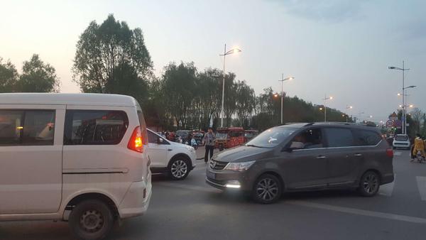 图为:沁源女警张丽娟在事故现场进行车辆疏导