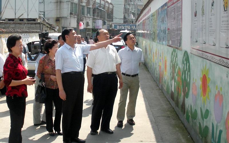 赵玉莲(左一)陪同省“六五”普法督查组察看百米法治(文化)长廊