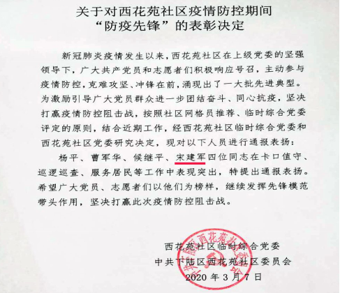 在这次疫情阻击战中,宋建军听党指挥、不惧“疫魔”、为民值守、连续作战、严管厚爱的作风受到社区的充分肯定,被西花苑社区临时党委评为社区“防疫先锋”。他逆行而上的担当也受到了中色集团纪委的充分肯定。