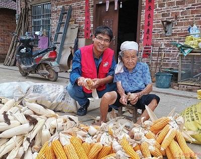 李守亭在汪淋屯入户走访,与94岁的老奶奶一起剥玉米