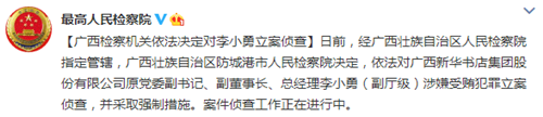 据最高人民检察院微博消息,日前,经广西壮族自治区人民检察院指定管辖,广西壮族自治区防城港市人民检察院决定,依法对广西新华书店集团股份有限公司原党委副书记、副董事长、总经理李小勇(副厅级)涉嫌受贿犯罪立案侦查,并采取强制措施。案件侦查工作正在进行中。