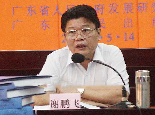谢鹏飞1950年10月生,2011年4月被免去广东省政府副秘书长、省政府发展研究中心主任、党组书记职务。广东省政府发展研究中心网站显示,该中心是广东省人民政府直属决策与政策研究机构。