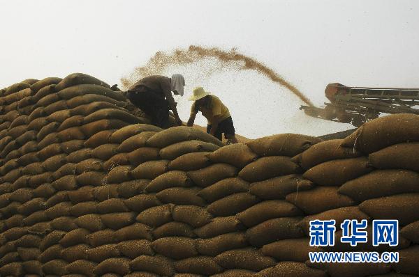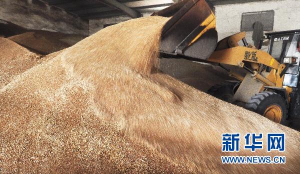 山东邹平县长山镇一家粮食合作社进行储粮(6月16日摄)。 国家粮食局有关负责人日前表示,随着国家相继启动粮食物流建设项目、仓储建设项目、食用油库建设项目以及地方和企业加大粮库建设投入,我国粮油仓储设施条件得到根本改善,目前基本解决“卖粮难”“储粮难”问题。截至2010年底,全国共有仓储企业18326户,仓容3.9亿吨。新华社发(董乃德 摄)