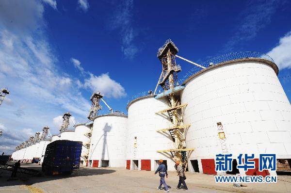 两名工人从中储粮虎林直属库的粮仓旁走过(2008年9月摄)。国家粮食局有关负责人日前表示,随着国家相继启动粮食物流建设项目、仓储建设项目、食用油库建设项目以及地方和企业加大粮库建设投入,我国粮油仓储设施条件得到根本改善,目前基本解决“卖粮难”“储粮难”问题。截至2010年底,全国共有仓储企业18326户,仓容3.9亿吨。(新华社记者 王建威 摄)