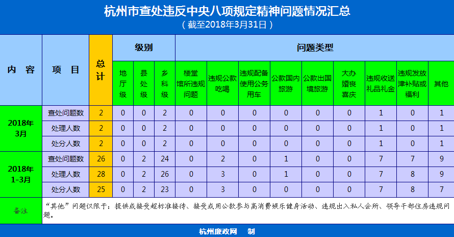 2018年1-3月,杭州市累计开展正风肃纪专项行动1046次,累计查处违反中央八项规定精神问题26起,问责处理28人,处分25人。