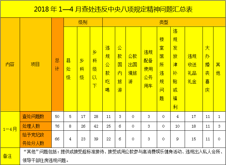 2018年1—4月,全市共查处违反中央八项规定精神问题50起,处理76人,给予党纪政务处分66人,分别比去年同期上升28.2%、46.2%、53.5%,体现越往后执纪越严的要求。市纪委监委分2批对10起14人违反中央八项规定精神问题进行通报。