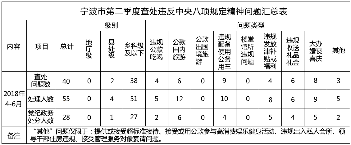 从查处问题类型看,违规问题数量较多的分别是违规配备使用公务用车问题(9起)、大办婚丧喜庆问题(8起),公款国内旅游问题(6起)、违规收送礼品礼金问题(6起),这四类问题占查处总数的72.5%;从处理干部级别看,查处县处级干部4人,占7.3%;乡科级及以下干部51人,占92.7%。(宁波市纪委监委)