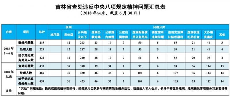 为进一步加大通报曝光力度,持续传导压力、释放信号,吉林省纪委建立了全省查处违反中央八项规定精神问题情况定期通报制度。2018年以来,截至6月30日,全省查处违反中央八项规定精神问题情况如下: