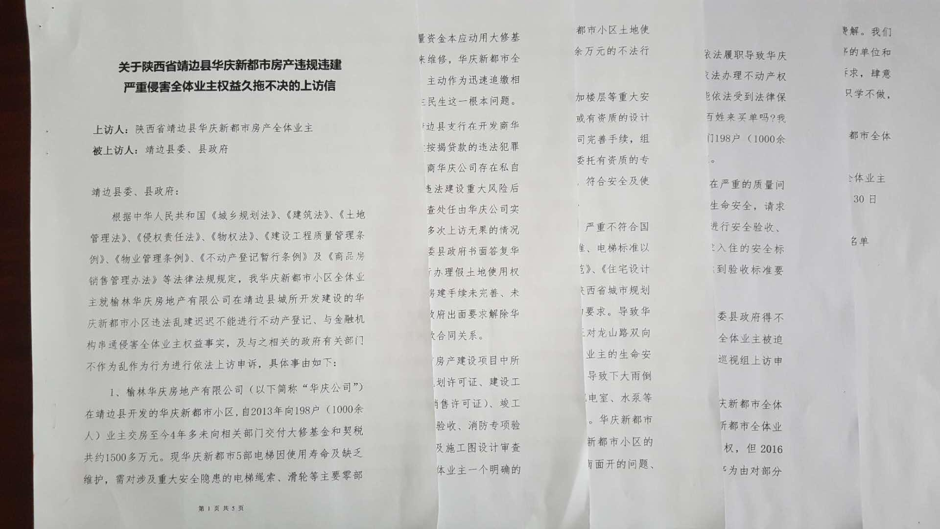 本网讯(任茂强)前段时间一段名为《百人实名举报陕西靖边县黑社会》的视频被网友们争相转发,引起了社会的关注。近日,有关单位收到了一封由一百六十多人签名的《关于陕西省靖边县华庆新都市房产违规违建严重侵害全体业主权益》的上访信。