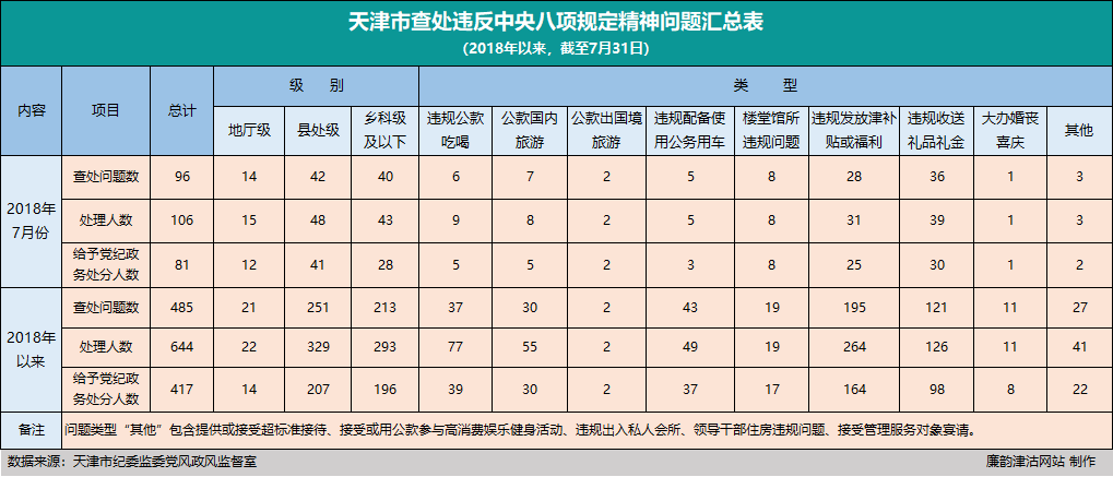 2018年1至7月,天津市各级纪检监察机关查处违反中央八项规定精神问题485起,处理644人,给予党纪政务处分417人,其中7月份查处违反中央八项规定精神问题96起,给予党纪政务处分81人。