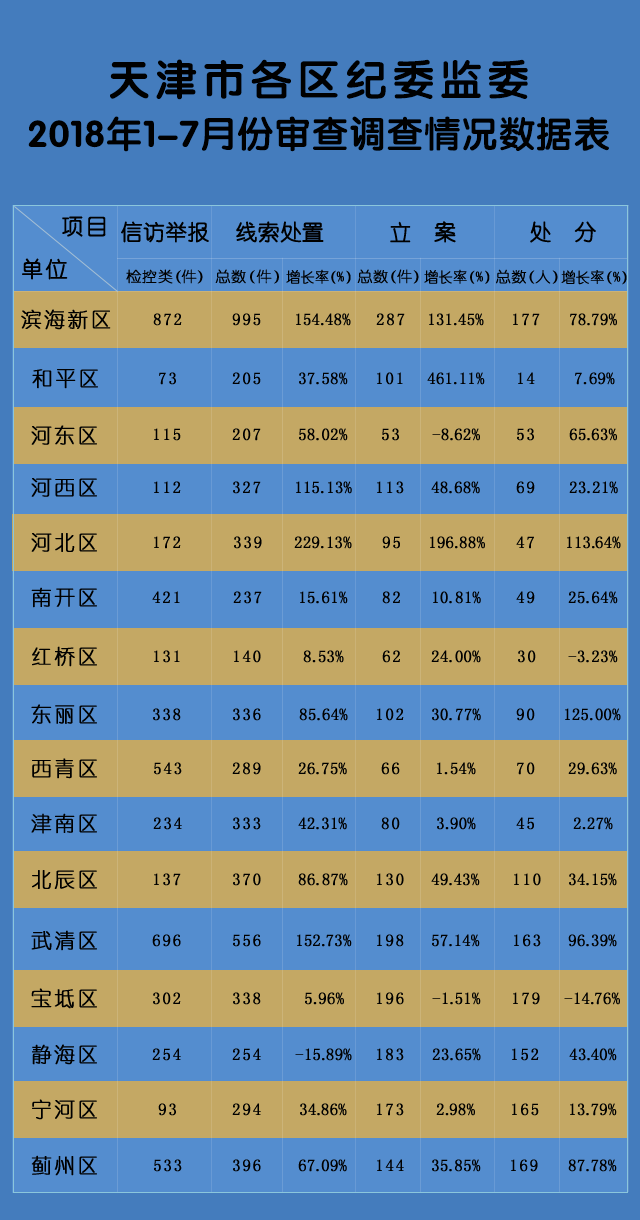 2018年1至7月,天津市纪检监察机关共接受信访举报(检举控告类)19595件次,处置问题线索11467件,同比分别增长157.19%、65.61%;立案2857件,结案2363件,处分2344人,同比分别增长41.16%、43.04%、41.38%。其中,立案厅局级干部73件、县处级干部694件;处分厅局级干部56人,县处级干部617人,乡科级干部466人,一般干部229人,农村、企业等其他人员976人。