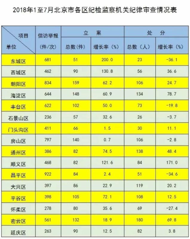 2018年1至7月,北京市各级纪检监察机关共接受纪内信访举报13136件(次),处置问题线索9000件,谈话函询2201件次,立案1987件,增长36.0%,处分1769人(其中党纪处分1530人),增长14.7%。处分厅局级干部53人,县处级干部303人,乡科级部383人,移送司法82人。查处违反中央八项规定精神和市委实施意见278人,“小官贪腐”218人。