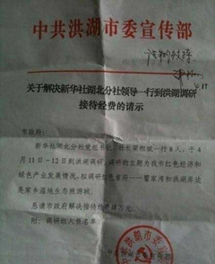 9月23日,网络上出现“关于解决新华社湖北分社领导一行来洪湖调研接待经费的请示”的图片帖文,帖文中称,新华社湖北分社一行8人,于4月11日-12日到洪湖调研,调研主题为洪湖市红色经济和绿色产业发展情况,“恳请市政府解决接待经费肆万元”,并附有调研人员名单。图片中的纸张带有洪湖市委宣传部的红头,文尾盖有市委宣传部红章。