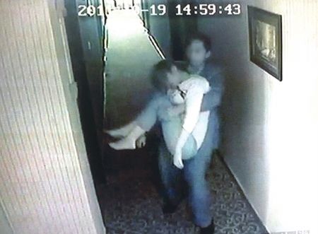 酒店监控录像显示:一名穿淡青色西服的男子抱着一名女子进入客房(为保护当事人隐私,该图已作技术处理)