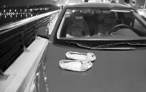 女子驾驶的红色轿车引擎盖上留有一双鞋,副驾驶座上留有便签本、手机等物 图片来自网络