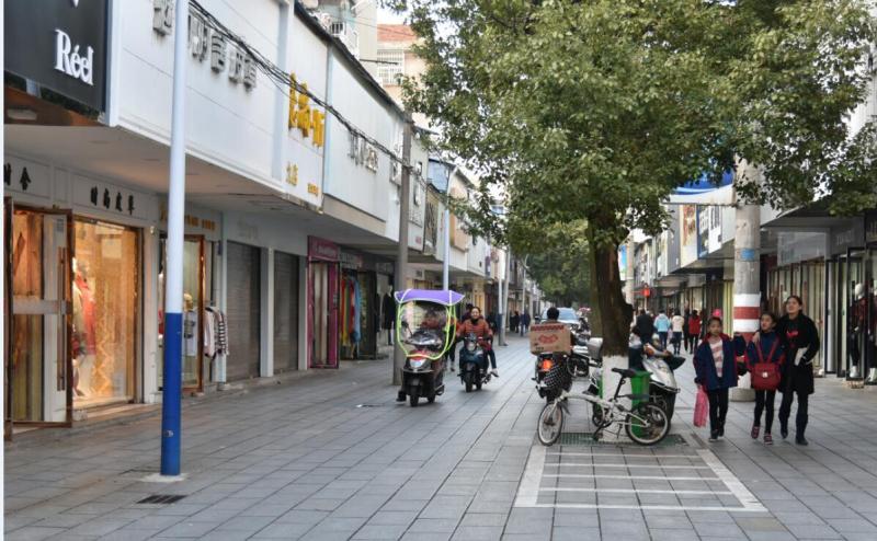 11月19日,岳阳县城,冬阳温暖。作为全县最繁华的商圈,荷花路服装步行街人来人往,生意红火。