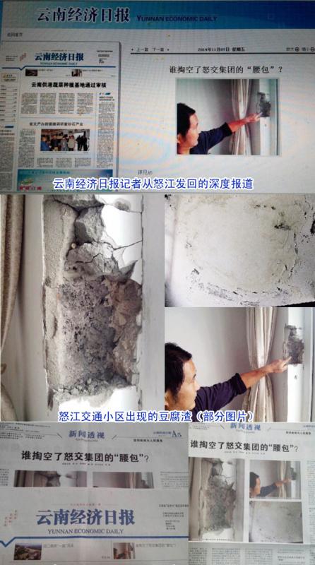 10月28日下午3点左右,经报记者在怒交集团安全部支书和学海的带领下,走访了怒交集团“交通小区”,职工张庆国告诉记者,他们居住的房屋只有7年时间,但现在房屋墙面已经开裂,一下雨就会漏水进来。“房屋建成问题工程,完全是因为交运集团负责人杨XX暗箱操作、以权谋利的结果。”张庆国说,建设交通小区时,公司领导公开招标,暗箱操作,利用手中的职权把小区建设的工程发包给他的亲兄弟杨文(化名)和其他亲戚。杨文在建设过程中故意加大原材料成本,做大工程造价。随后,又在建设中偷工减料,把职工住房建成了问题工程。张庆国透露,在建设小区那时,空心砖的单价在六库是每块1.1元,“但是他们偏偏不用,反而跑到离六库200多公里远的大理下关去采购4元一块的空心砖,而且还是质量较差的"煤渣砖",他们这样做的用心不言而喻。”张庆国说。“记得刚搬进来时,我们就发现窗户漏水,我们住户多次向集团领导反映情况,问题一直得不到解决,直到今年5月份,全部住户"闹"了起来后,领导才去州住建局申请大修理资金来维修。”
