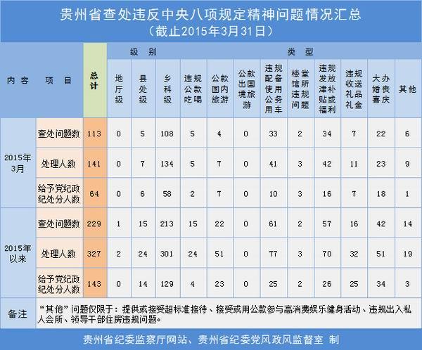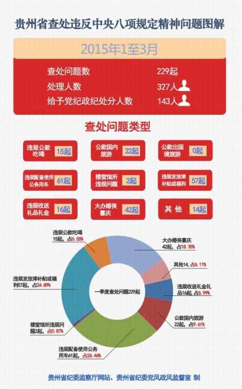 一季度,贵州省共查处违反中央八项规定问题229起,处理327人,其中给予党纪政纪处分143人。从统计类型来看,问题相对突出的是违规配备使用公务用车、违规发放津补贴或福利、大办婚丧喜庆以及公款国内旅游,分别占违规问题总数的26.46%、24.89%、18.35%和9.61%。“五一”临近,贵州省将持续加大对中央八项规定执行情况监督检查力度,严查各类顶风违纪行为,对典型问题坚决通报曝光,形成有力震慑。(贵州省纪委)