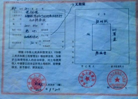 .伪造的土地使用证内页(第二个公章已被县国土局证实是伪造的)