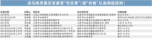 根据公诉机关指控,一串涉嫌买官的名单浮出水面(见上表)。另外还有两人为让马伟灵“在日常工作中提供支持”,也送了钱财。据指控,2012年,汕尾市公安局副局长李越送了两条价值为1.8万元及6万余元的金条后,他自己称“感觉马伟灵确实给予了更多支持”;2012年,汕尾市公安消防支队支队长杨和顺送了价值25万元的象牙一根,他认为自己能上任,也必须经过马的应允。