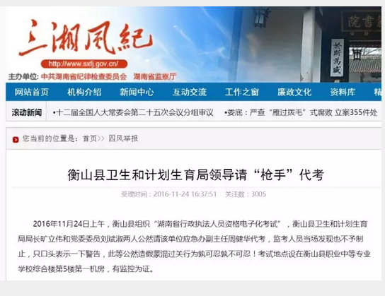 据湖南省纪委官方微信消息,近日,湖南省纪委网站的“四风”举报一键通收到网友举报,称湖南衡山县一局长缺考请“抢手”替考及监考人员存在问题等,经调查核实,情况属实,目前,涉事的衡山县卫生和计划生育局局长旷立伟已被免职,另有7人受到处分。