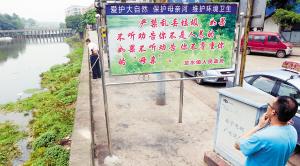 昨日,大足龙水镇濑溪河市民陶先生在观看宣传板上的标语。(重庆晨报首席记者 肖庆华 通讯员 王海 摄)