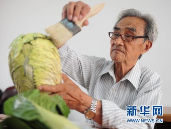 6月13日,八旬老人李律在修饰铜雕“四菜一汤”中“汤”的原料——铜雕白菜。新华社发(王卓 摄)