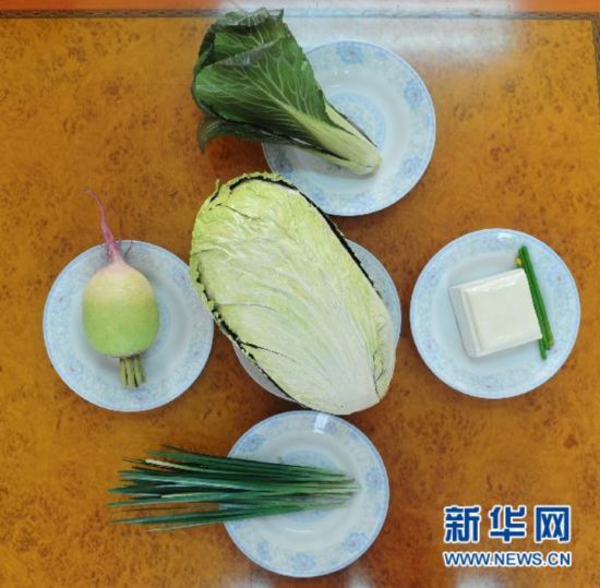 八旬老人李律制作完成的“四菜一汤”手工铜雕,中间为“汤”的原料——铜雕白菜(6月13日摄)。