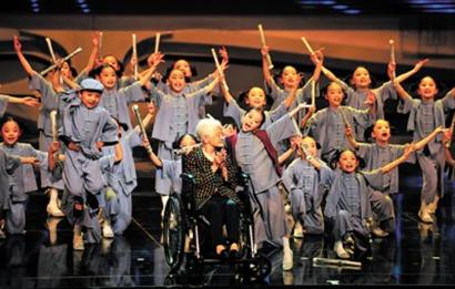 音乐周开幕式上,《卖报歌》当年的原型杨碧君(中)与云南聂耳小学、上海报童小学的孩子们一起表演《卖报歌》。(沈家善 摄)