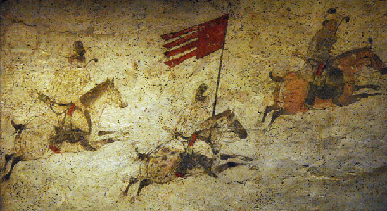 (2)这是陕西历史博物馆唐代壁画珍品馆内展出的章怀太子墓《狩猎出行图》(局部)(6月13日摄)。