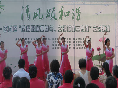近日,江苏省南京市玄武区纪委、玄武湖街道党工委联合在钟麓花园社区广场举办“清风颂和谐”——玄武区“反腐倡廉我参与、文明城市大家建”广场文艺演出。来自玄武区各街道、社区的群众文艺团体自编、自导、自演了不同形式的节目,受到社区居民的广泛欢迎,营造出了浓厚的廉政文化氛围。图为演出现场。 (张志国 摄)