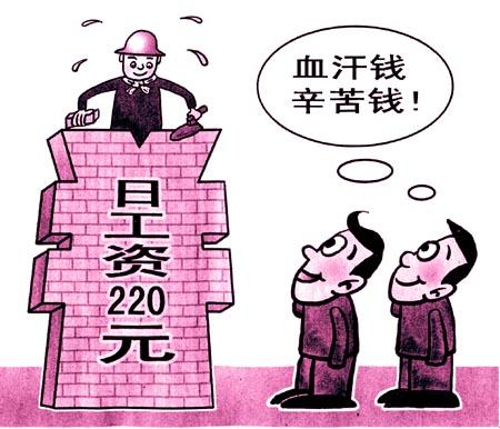 近日,网络盛传一份民工工资表,内容显示泥工日工资220元,最高日工资是队长的350元。“提高劳动报酬在初次分配中的比重”已成为自上而下的共识,应该说,当下的农民工工资在人口红利后理性归位,并不能说其薪资水平“高”了,只不过在初次分配中还原了其劳动价值的本来面目罢了。(摘自《法制日报》)