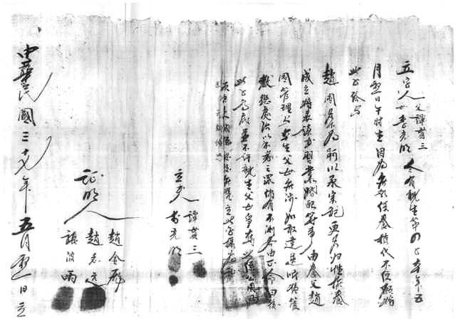 今有亲生第四子,本年五月初一午时生,因为无乳保养、携带不便,愿将此子给与(予)赵囤名下为嗣,以承宗继,更名归姓抚养成立。将来读书习业婚配等事,由养父母管理,亲生父母无涉。(孩子)如敢违逆听凭管教惩处,治以不孝之众;稍有不测,各由正命。日后此子高底(低),并不许亲生父母争夺。此系公用两愿,决无反悔。恐后无凭,立此字据为证。