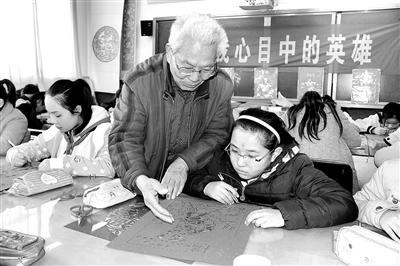 下图:山东省临沂市兰山区白沙埠镇中心小学日前举办“我心目中的英雄”系列活动,通过剪纸、绘画、诗朗诵等丰富多彩的活动形式,缅怀先烈事迹,感怀先烈精神,培养爱国情感。图为该市民间剪纸艺术大师王艳俊正在为孩子们讲述英雄故事,传授剪纸技艺。王伟勋 摄