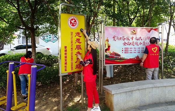 图为9月27日,全国“最美志愿服务社区”宣州区宝城社区组织“五彩红”志愿服务队志愿者,围绕活动主题,参加志愿服务广场环境卫生大扫除,并为居民小区毒饵站、灭蝇笼逐一补投药物。