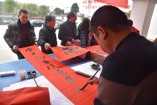 “风正气顺创大业,政通人和奔小康”,“廉洁如和风拂面,清正似细雨润田”,“大地回春山青水秀景色美,全民尚廉风清月朗风气新”……在蒲圻办事处金潭村村委会搭起的台子上,赤壁市书法家协会的会员们挥毫泼墨,一副副廉政题材的春联跃然纸上,赢得群众阵阵喝彩。