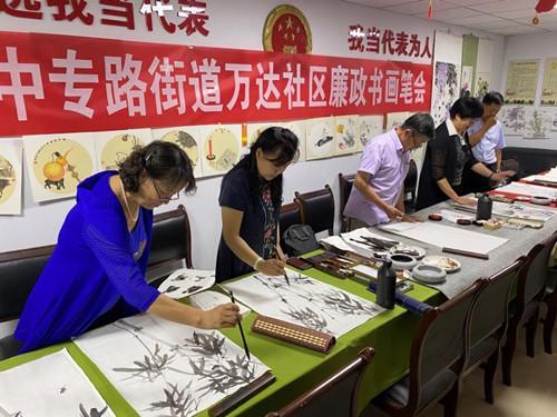 近日,中专路街道万达社区按照街道纪工委的要求,结合社区党员多、书画爱好者多的特点,充分发挥社区自身优势,组织举办了以“清正廉洁 服务群众”为主题的廉政书画笔会。社区全体党员干部及书画爱好者积极参与到笔会中,创作出了许多富含廉政文化元素的优秀书画作品。