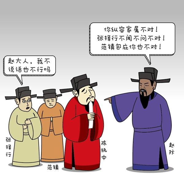宋史记载,宰相陈执中纵容家属殴打丫鬟致死,宋仁宗有意包庇,赵抃却先后上书二十多次要求对此严格执法并罢免陈执中。同时还弹劾了对此事不闻不问的谏官张择行和反对罢免陈执中的谏官范镇,并由此引起了与范镇长达一年多的论辩。最终结果是陈执中被贬,赵抃自身也被流放到外地。