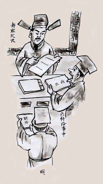 明:将御史台改为都察院。设六科给事中,对六部官员督察,向皇帝进行规谏。