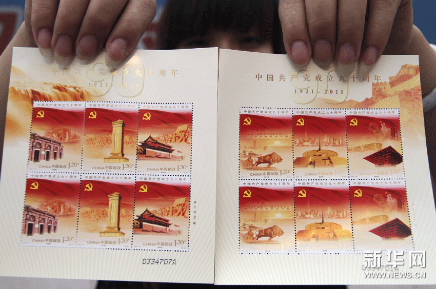 为纪念中国共产党成立90周年,中国邮政将于6月22日发行《中国共产党成立九十周年》纪念邮票,包括1套共6枚的主题邮票和1枚小型张,6枚邮票分别以《开天辟地》、《烽火岁月》、《执政创业》、《改革大潮》、《世纪跨越》、《科学发展》为主题。新华网图片 王九忠 摄