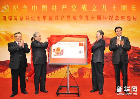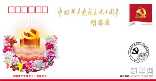新华网北京6月30日电 为纪念中国共产党成立九十周年,国家邮政局和中国邮政集团公司将于7月1日发行《中国共产党成立九十周年》纪念封一枚。“七一”前夕,胡锦涛总书记专门为纪念封题词“中国共产党成立九十周年”。